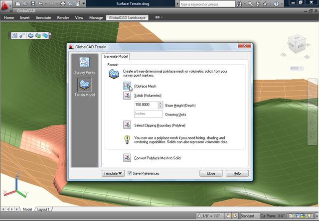 • Easily create 3D surface terrains (mesh and solids options) covering vast areas with a single mouse click.